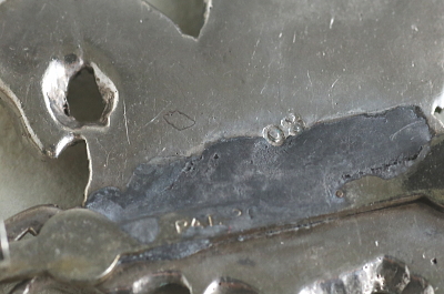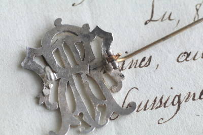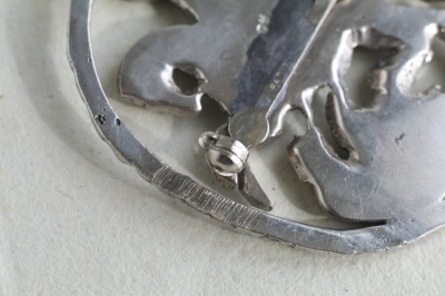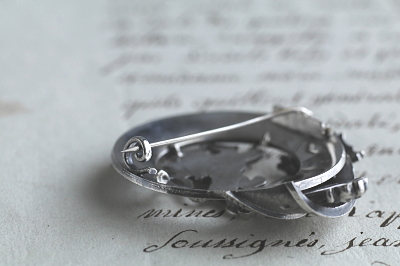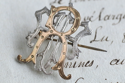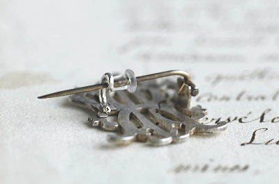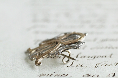 ★JW555C ピアスドワーク シルバー&ゴールドモノグラムブローチ 37×43mm (16.9g) / ¥32,000.-〔税込み・送料別〕 シルバー / K18ゴールド/合金ピン 送料:宅配便送料無料【3万円以上】 ◆ご注文方法はこちら◆ 銀板からノコギリで切り抜くピアッシングで造られたモノグラムのブローチ。繊細な細工で、大胆な図案を表現した誇り高いモノグラムデザインです。中央のRのイニシャルは銀の上から薄いK18ゴールドの板を張った贅沢な仕上げで、危険なほどに長いピン先は、ヴィクトリア時代の特長を示しています。貴族やブルジョアが個人のものとして、または家系を表すジュエリーとしてオーダーしたものでしょう。丁寧な手作業で造られた仕上がりに気品が漂う、19世紀ヴィクトリア時代の、おそらくは英国製と思われます。刻印などはありませんがテスト済みのシルバー、K18ゴールド製。 とくに気になるダメージのないきれいなしっかりした状態です。アンティークのひとつの特長とも言えますが、ピンがかなり長いので、ご希望で、無償にてピン先を短く加工いたします。落下防止にシリコンストッパーをお付けします。 |