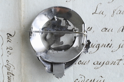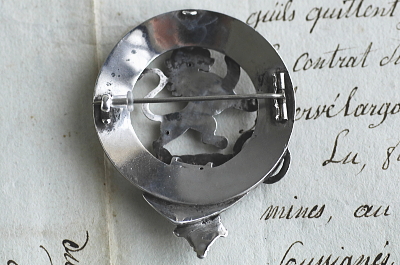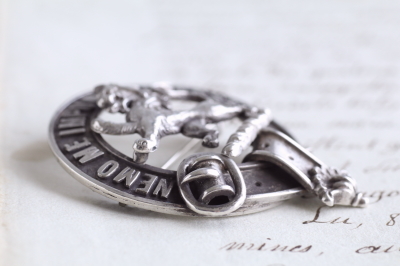 ★JW555F シルバー スコティッシュクランバッジ 48×60mm(23g) / ¥59,000.-〔税込み・送料別〕 シルバー 送料:宅配便送料無料【3万円以上】 ◆ご注文方法はこちら◆ 後ろ足で立ち上がり勇ましく構えたライオンと、周囲にはラテン語で【NEMO ME IPPUNE LACESSET】「何人も、我を害して罰を免れることはない」と刻まれた、銀の紋章は、スコティッシュクランバッジという。クランバッジとは、スコットランドの氏族(clan)に属する人々が、忠誠や誇りを示すために身につけたジュエリーで、この有名なモットーは、スコットランド王室のもので、多くの氏族で使われてきた。銀を使った、しっかりとした造りから、模倣したファッションアクセサリーや土産物ではなく、本物の、シルバースミスによって造られた正統なクランバッジだ。誇り高く勇敢なバッジは、身に着けるだけで力をくれそう。 1900年頃のスコットランド製と考えられます。刻印などはありませんがテスト済みのシルバー製。 とくに気になるダメージのないきれいなしっかりした状態です。落下防止にシリコンストッパーをお付けします。 |