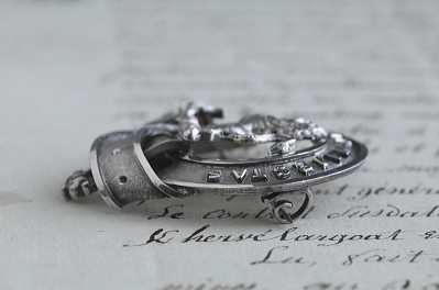★JW555E シルバー スコティッシュクランバッジ 44×54mm(18.1g) / ¥52,000.-〔税込み〕 シルバー 送料:宅配便送料無料【3万円以上】 ◆ご注文方法はこちら◆ 後ろ足で立ち上がり勇ましく構えたライオンと、周囲にはラテン語で【FLOREAT MAJESTAS】「王権よ、栄えあれ」と刻まれた銀の紋章は、スコティッシュクランバッジと呼ばれる。クランバッジとは、スコットランドの氏族(clan)に属する人々が、忠誠や誇りを示すために身につけたジュエリー。このクランバッジはライオン・ランパントの紋章とモットーから、スコットランド王家、スチュアート家のものであることが分かる。銀を使った、しっかりとした造りから、模倣したファッションアクセサリーや土産物ではなく、本物の、シルバースミスによって造られた正統なクランバッジだ。誇り高く勇敢なバッジは、身に着けるだけで力をくれそう。1900年頃のスコットランド製と考えられます。刻印などはありませんがテスト済みのシルバー製。 とくに気になるダメージのないきれいなしっかりした状態です。落下防止にシリコンストッパーをお付けします。 |