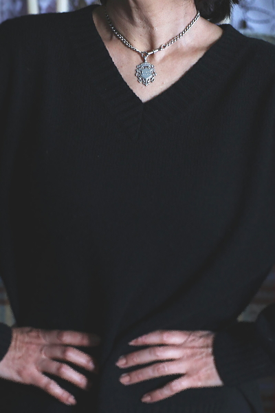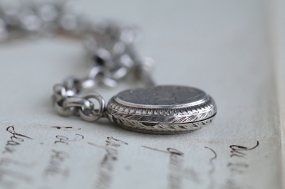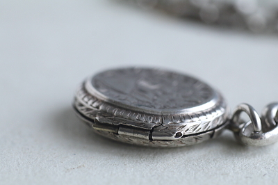 ★JW555D シルバーウォッチチェーンネックレス L64cm(30.4g) / ¥69,000.-〔税込み〕 800シルバー / シルバー 送料:宅配便送料無料〔3万円以上〕 ◆ご注文方法はこちら◆ イギリスのアルバートチェーンと、フランスのモチーフを連ねたウォッチチェーンを組み合わせて、デコラティブなネックレスに仕立てました。Tバーの片側の先にロケットが揺れるアルバートチェーンと、特徴的なモチーフを連ねたシルバーチェーンとの相性も良く、完成されたデザインのロングネックレスとして愉しめます。何れのチェーンも19世紀のアンティークですから、デコラティブだけれどクラシカルで上品に仕上がりました。ロケットやお気に入りのチャームを加えて、自分なりにアレンジするのも楽しそうです。 19世紀のイギリス、フランス製。アルバートチェーンは刻印はありませんが、テスト済みのシルバー製。フランスのチェーンはクラスプにボアヘッドの打たれた800シルバー製。 ロケットのヒンジ部分が破損して弱っていますので、ロケットは単にアクセサリーとして考えてもらう方が良いと思います。チェーン自体にはとくに目立つダメージの見られない、きれいなしっかりした状態です。 |