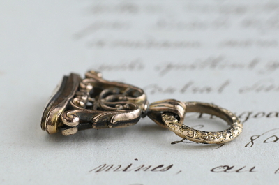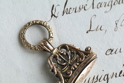 ★JW555G ヴィクトリアン メタルフォブシール 26×39mm (6.8g) / ¥28,000.-〔税込み・送料別〕 ロールゴールド 送料:Aランク 【送料ページはこちら】 ◆ご注文方法はこちら◆ 彫刻の施された特長的なリングに提げられたゴールドレースのフォブシール。もともと細い楕円の印面だったようだけれど、印面がフラットでなく曲がっており、最大の厚みが7ミリという薄さなのは、かなりの圧力が掛かってひしゃげたのだろうと思います。なぜか?どうやって?謎はこれからゆっくりと考察するとして、時代めいたデザインと美しいディティールが、なんならこのひしゃげ方も、無条件に心惹き付ける魅力的なローズゴールドのチャームです。ちょっと太めのベルベットリボンや、ゴツめのチェーンに通してペンダントにいかがでしょう。19世紀イギリスのロールゴールド(金張り)。 何らかの理由で形状が薄くひしゃげています。表層のゴールドが一部摩耗しています。とくに強度的な問題はなく、しっかりした状態です。ネックレスチェーンは付属せず、フォブシールのみの販売です。 |