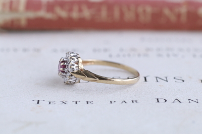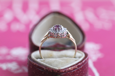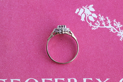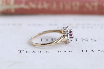 ★JW556A ルビー&ダイヤ デイジーリング LONDON 1985 サイズ11.5号 (1.4g) / ¥54,000.-〔税込み〕 天然ルビー / 天然ダイヤモンド / K9ゴールド 〔品質保証書付き〕 送料:宅配便送料無料【3万円以上】 ◆ご注文方法はこちら◆ ルビーを花芯に、ダイヤの花弁を持つ小さな丸いデイジーリング。中央のルビーは透明感のある程よい鮮やかさのピンク。ホワイトゴールドフェイスにメレダイヤを留めた、眩しい白銀の煌きの中で、落ち着いた表情で輝きます。ずーと昔からある花形のデザインに、クラシックな雰囲気も感じつつ、普遍的で古さを感じさせない可愛さのリングです。 とくに気になるダメージのない、きれいなしっかりした状態です。写真のアンティークケースは付属しません。 |