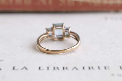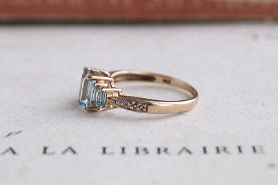 ★JW556B ステップカット 3ブルートパーズリング SHEFFIELD 2013 サイズ13号弱 (1.9g) / ¥52,000.-〔税込み〕 天然トパーズ / 天然ダイヤモンド / K9ゴールド 〔品質保証書付き〕 送料:宅配便送料無料【3万円以上】 ◆ご注文方法はこちら◆ 直線的なステップカットのスカイブルーの透明感と、立体的な配列が、ちょっと都会的なクールな可愛さ。とはいえ、十数年前の品ながら、80-90年代のムードも漂わせる、行き過ぎないクールさがチャーミングです。ブルートパーズのステップカット。独特の透明感と煌きがクセになりそうな、2013年、シェフィールド製。 とくに気になるダメージのない、きれいなしっかりした状態です。写真のアンティークケースは付属しません。 |