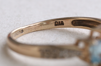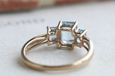 ![]() センターストーンのサイズは4.9×6.9ミリ。フェイスサイズは11.8×7.3ミリ。 リングのブルートパーズに近いところに両脇に1石ずつ、小さなダイヤモンドが添えられています。 |