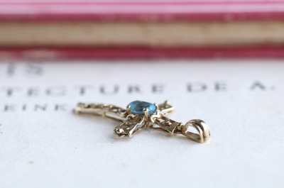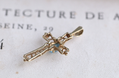 ★JW556D ブルートパーズ ゴールドクロスペンダント 14×27mm(0.8g) / ¥30,000.-〔税込み・送料別〕 天然トパーズ / K7ゴールド 送料:宅配便送料無料【3万円以上】 ◆ご注文方法はこちら◆ 小さなゴールドのレースのクロスペンダント。明るいスカイブルーのトパーズが爽やかに輝いて清々しい。ヴァチカンを除けば2センチの高さの小さな十字架です。さりげなく身に着けられる感じがおすすめです。20世紀後半のUKヴィンテージ。 とくに気になるダメージのないきれいなしっかりした状態です。刻印などはありませんが、テスト済みのK7ゴールド。ネックレスチェーンは付属せず、ペンダントのみの販売です。写真のアンティークケースは付属しません。 |