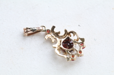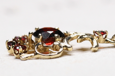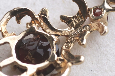 ★JW556E ヴィンテージガーネットペンダント LONDON 1982 9×20mmm(バチカン含む)(0.5g) / ¥28,500.-〔税込み・送料別〕 天然ガーネット / K9ゴールド 送料:Aランク 【送料ページはこちら】 ◆ご注文方法はこちら◆ クラシックな造形のゴールドレースに濃密な赤のガーネットを置いて、周りにもちっちゃなちっちゃな赤い煌きのかけらを配して。濃厚なゴールドとダークレッドのコントラストは、この小ささだと軽やかな艶っぽさが感じられて、とても魅力的ですよ。1982年のロンドンから。 センターのガーネットの裏に欠けがあります。表からは僅かにガードルの端が欠けて見えますが、肉眼では分からないレベルです。その他にはダメージのないしっかりした状態です。 |